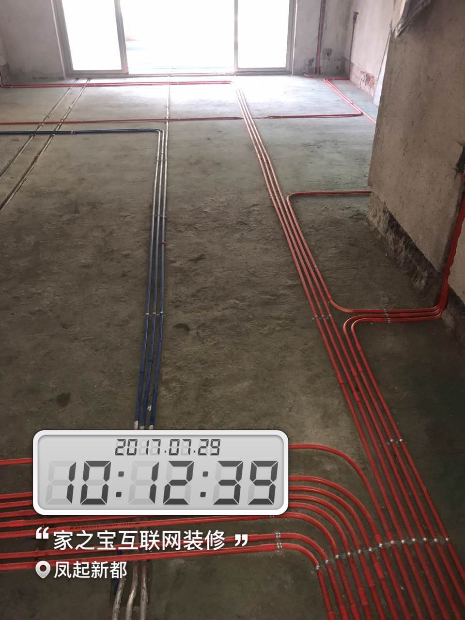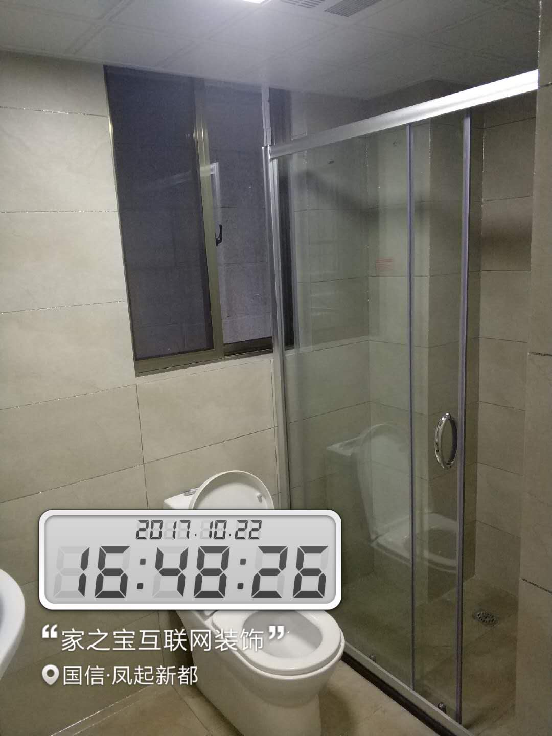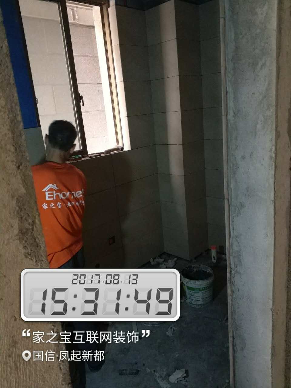 墻磚鋪貼,使用水平儀投射水平線,陽角處采用磨邊45°碰角工藝。